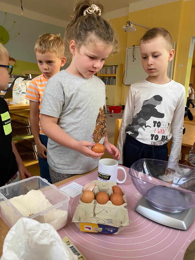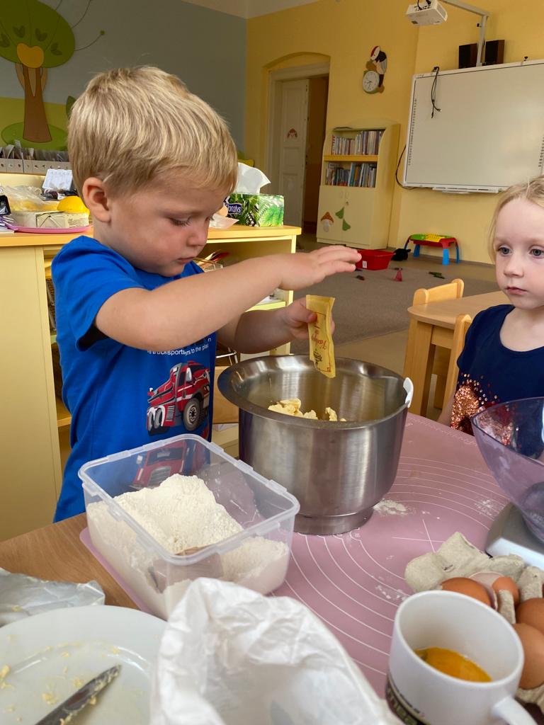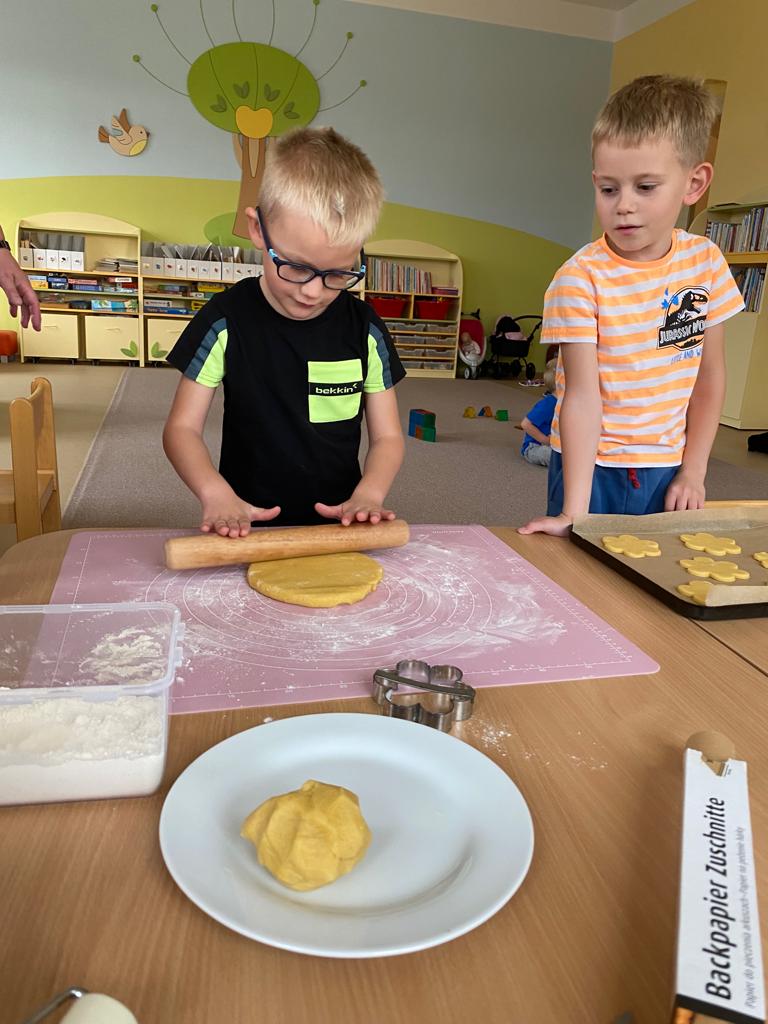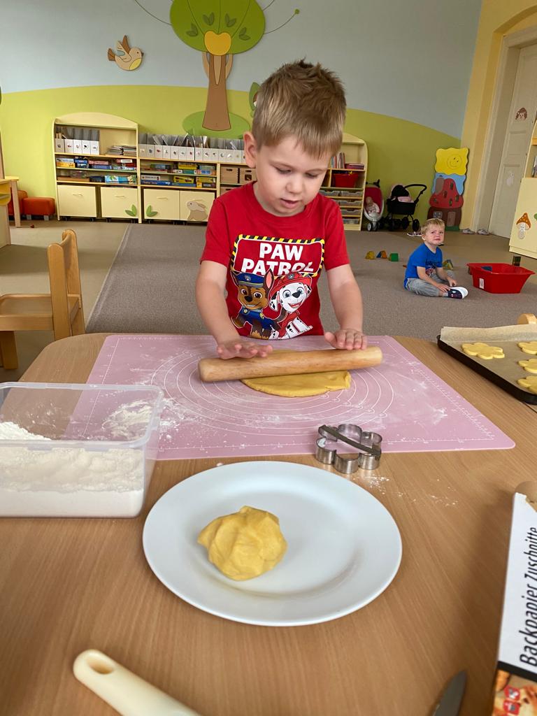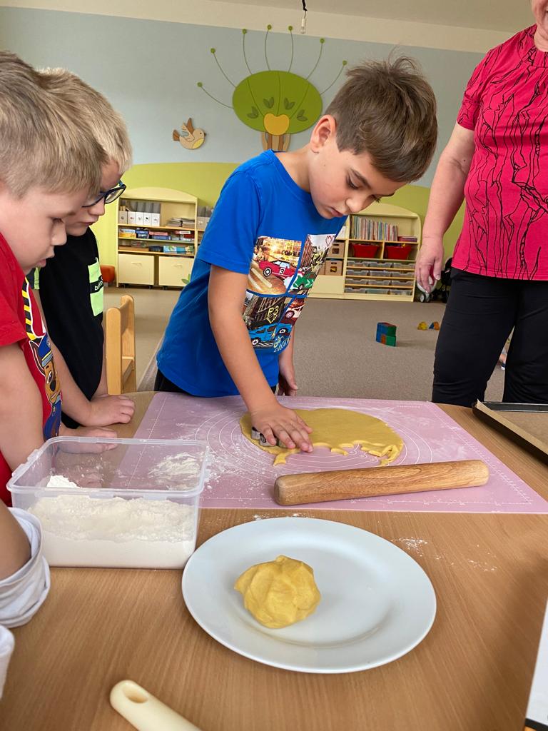 Dvoudenní projekt ve školce. Děti si vyzkoušely přípravu těsta, zadělávání i vykrajování posvícenských hnětynek. Nakonec si hnětynky i ozdobily.